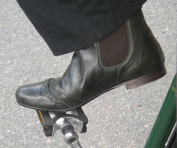 This brings me to the general issues of footwear on bicycles. I don't like to pretend that something is easy for me when it is not, just for the sake of making cycling seem super-easy and convenient. And finding shoes to wear while cycling is not always easy for me. In my pre-velo days, I wore mostly dressy high heeled shoes, and occasionally flat dressy shoes like the exquisite Italian green ankleboots in these photos. However, I must confess that I find 75% of my footwear problematic to wear while cycling.
